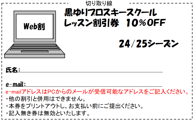 下記の割引券にパソコンでお使いのe-mailアドレスを記入し、お支払い前にご提出ください。